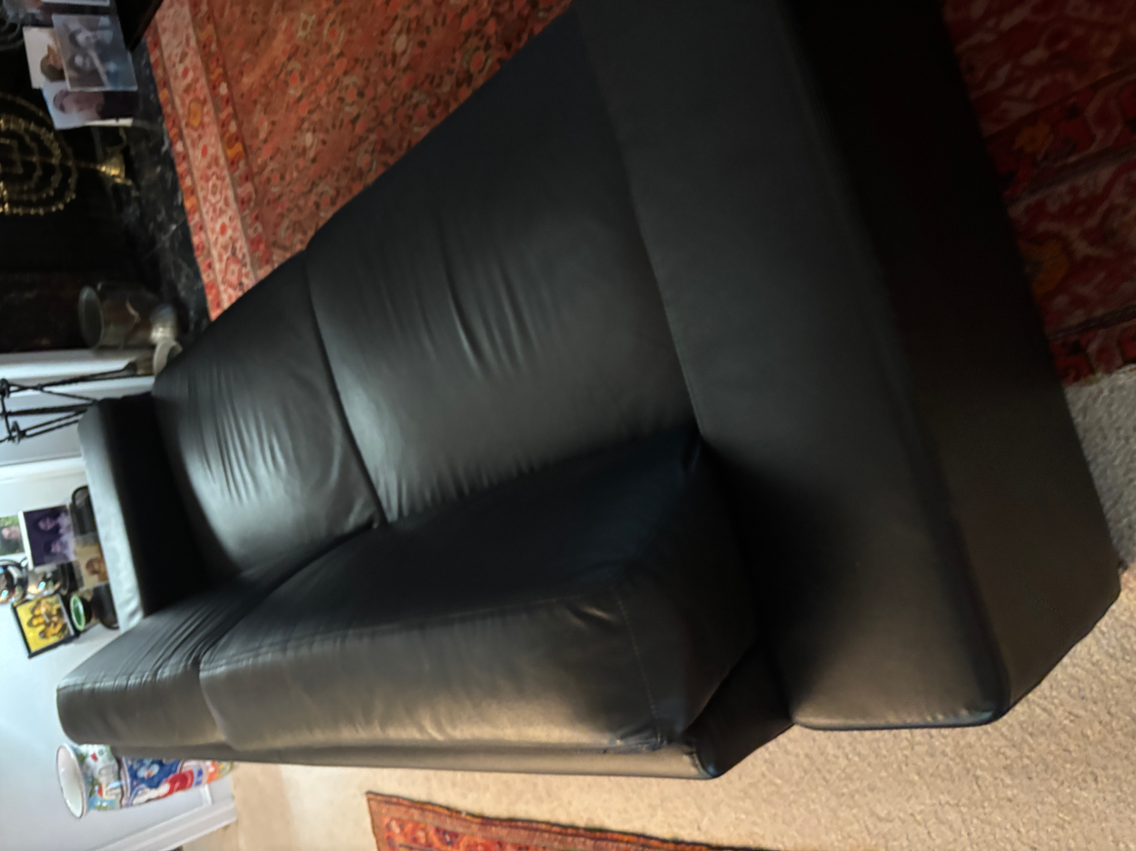 2 side tray tables, one leather couch, one glass coffee table, one storage bag
