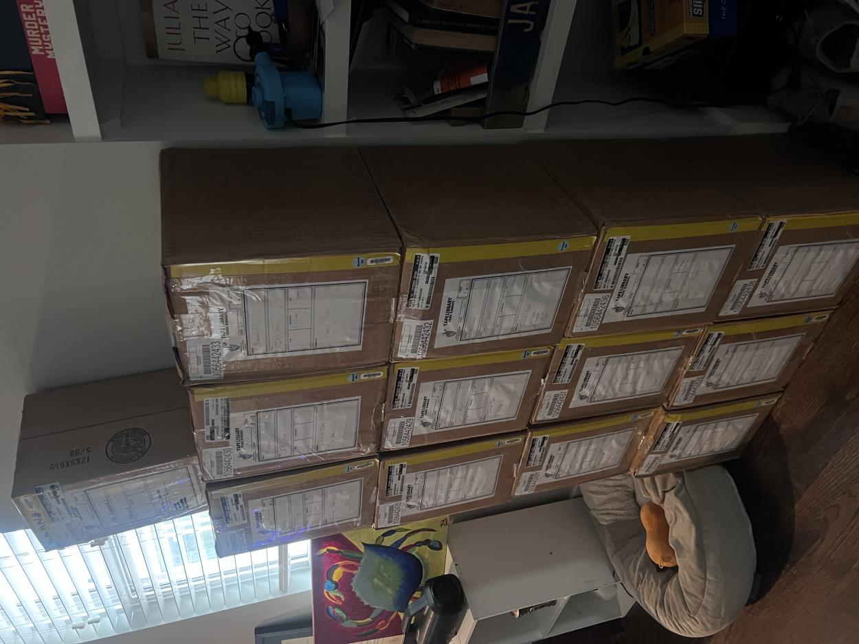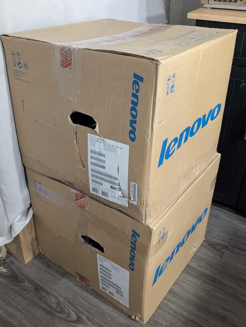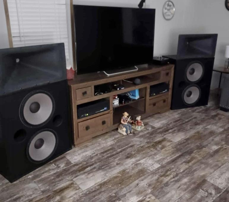 7 speakers that are packed in boxes. Pics will come later. They can be stacked in a 3x2 pattern (no more than 2 to a stack). Boxes weigh roughly 35-40lbs each. 7 total.