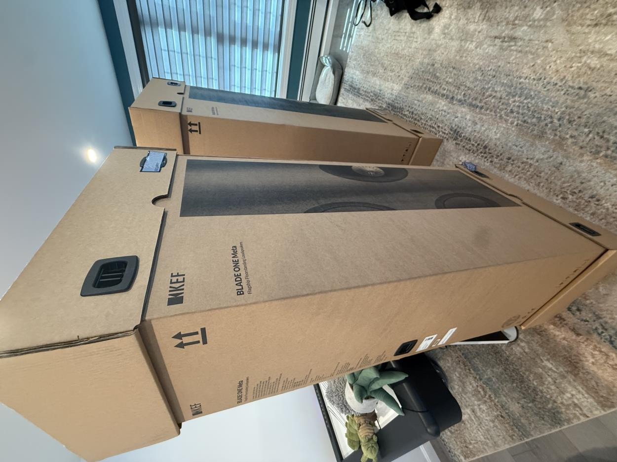 (2) Speakers inside original box with foam form inserts, inside another cardboard box with 2-3" of foam peanuts underneath the original box and up the sides.