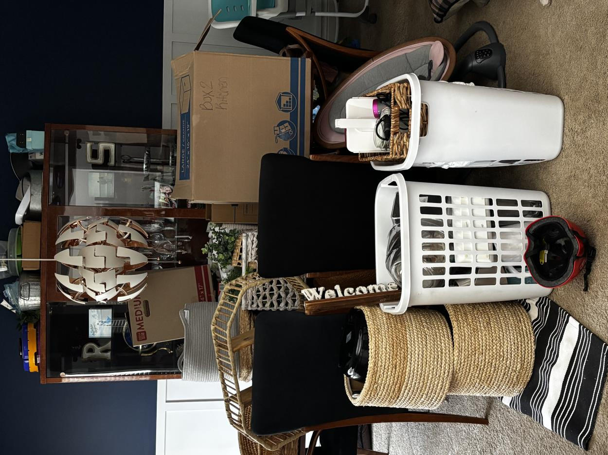 Includes 3 boxes, 1 crate, 2 laundry baskets, 2 pots, a decor shelf & 2 folded jute rugs