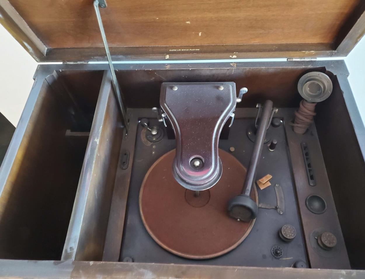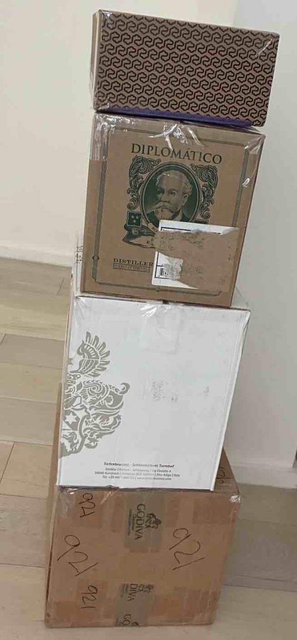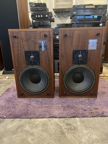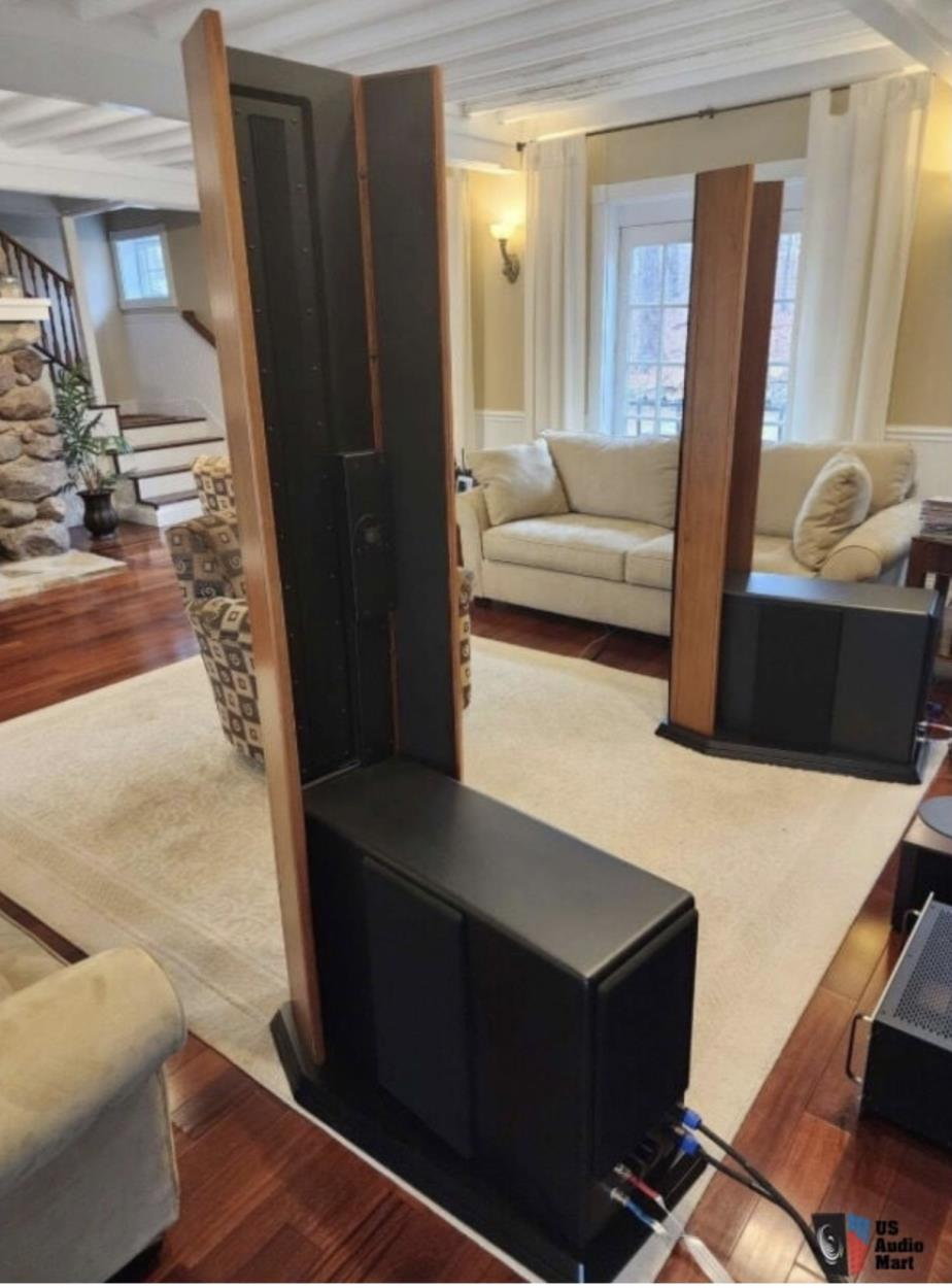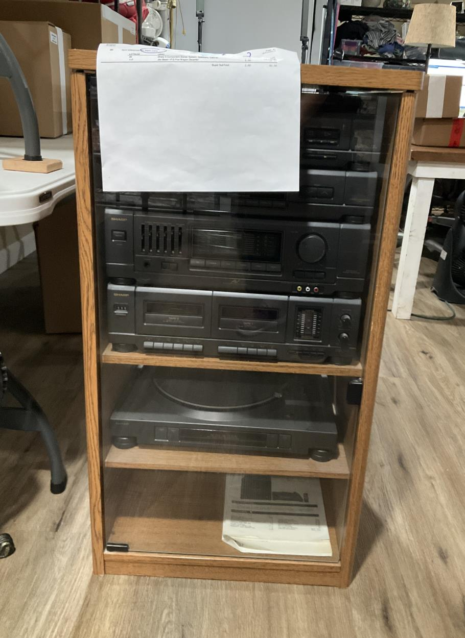 three boxes of audio equipment, one box of accessories, one bag with turntable cover