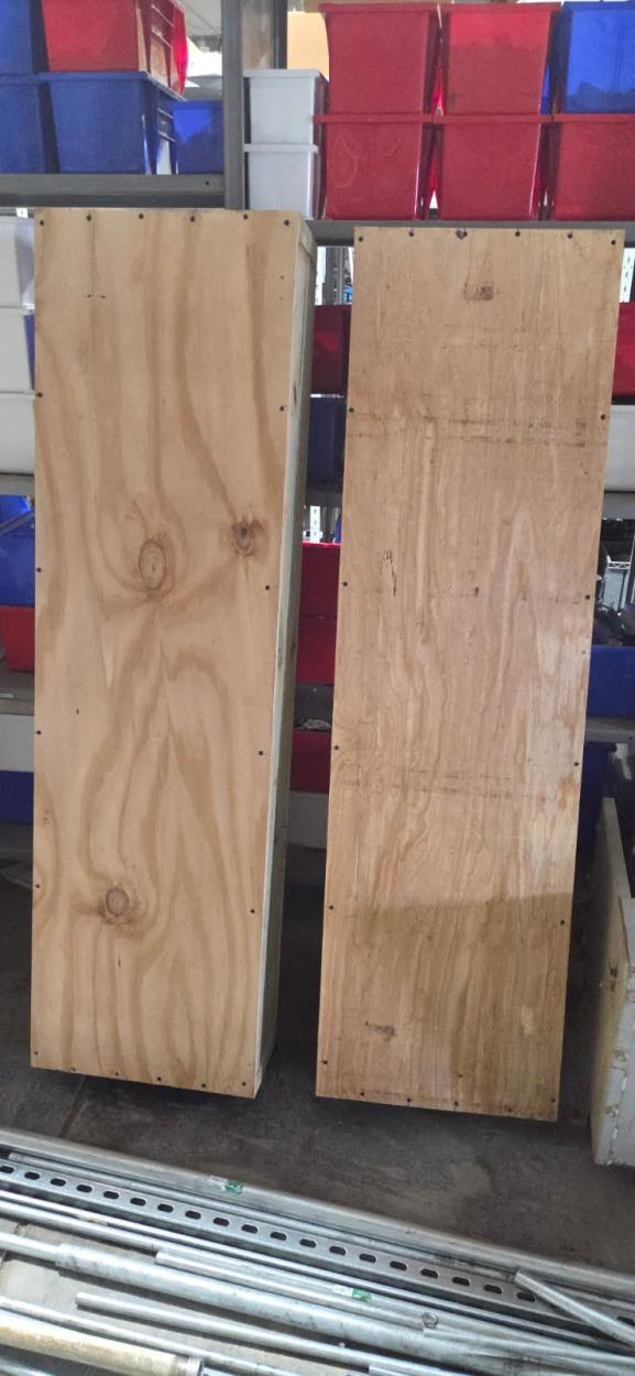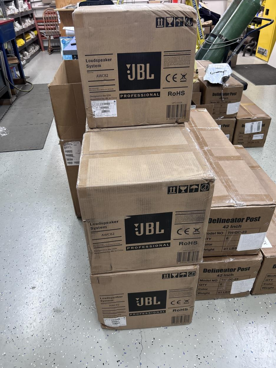 Palletized speakers in crates.