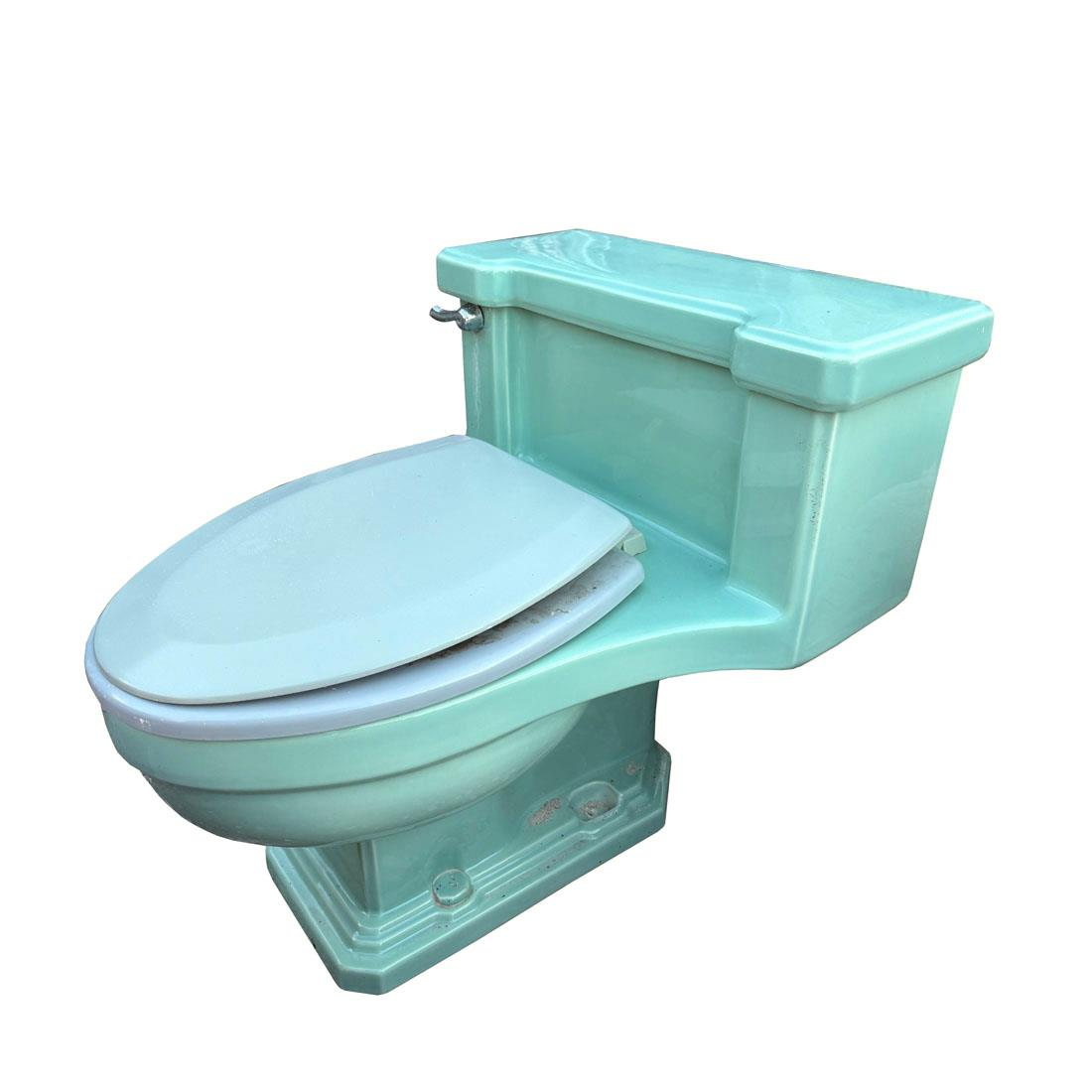 Porcelain vintage green toilet. The tank lid does come off. Toilet needs to be strapped to inside wall of trailer so it doesn't topple over.