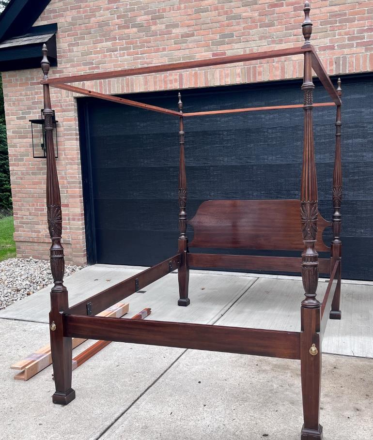 PLEASE READ: Bed breaks down completely: finials come off the top, canopy is 4 "sticks". Side rails detach from head board and footboard. Footboard posts come off. Headboard posts do not. The tallest point is the headboard post, w/o finial is about 78-80".