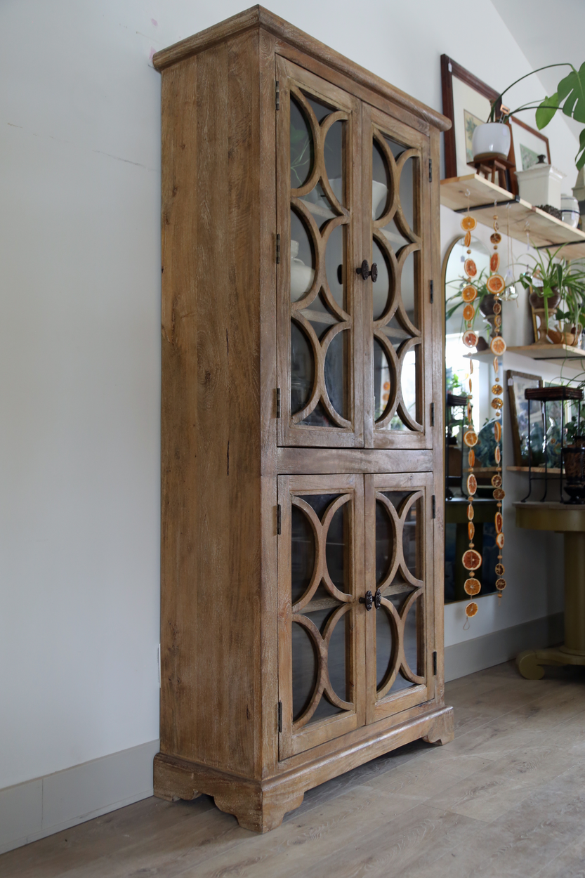 Glass panels in the cabinet doors. One piece. Take the driveway down to the red garage out back :)