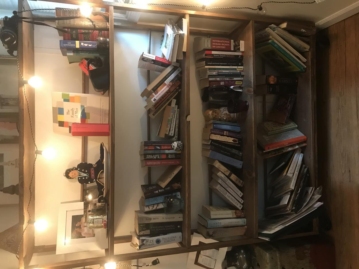 Bookcase comes in 2 pieces, glass door top and bottom two drawers/two door cabinet. (fragile)