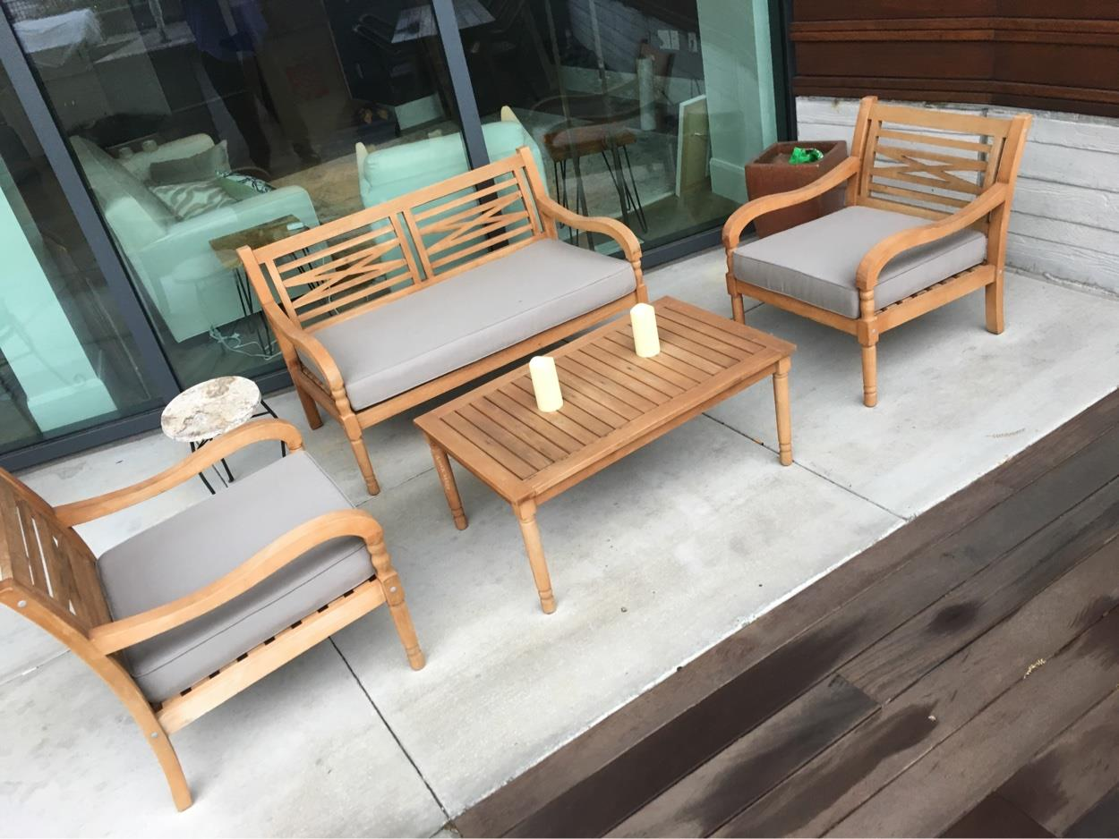 One sofa, one loveseat, two chairs, one coffee table, one dining table and four chairs