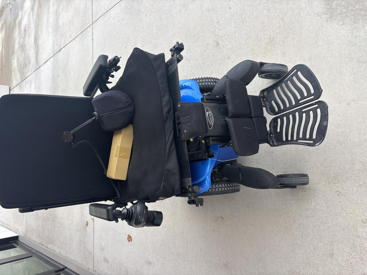 Handicap scooter breaks down into four pieces to fit in the trunk of a car. This scooter is only three pieces since it doesn’t have the battery. The second picture shows a black lollipop switch that freeze the wheels so you can roll it freely. It is a 20 year-old scooter that will own cost me $185.