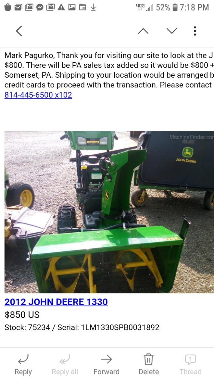Pickup location is a dealership. Business hours m-f 7am-4pm and saturday 7am-11am. Must drive mower on trailer. No loading assistance. Drop off location is residential. Mower runs and drives.