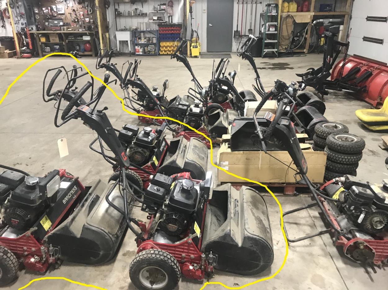 The items are the three mowers circled in yellow. The grass baskets will be placed over the handlebars.