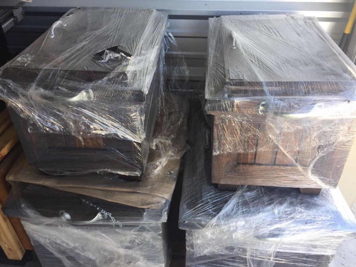 This item is enclosed in a cardboard box and strapped to a wooden pallet.