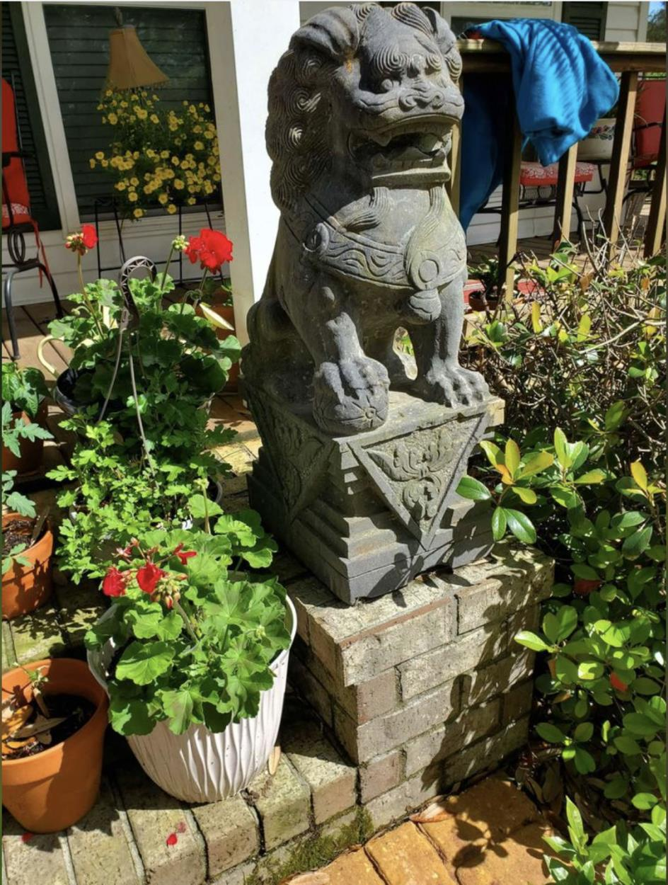 This is a pair of outdoor statuary Foo Dogs, decorative statues that are on a porch. I believe they are made of concrete, the seller says they are very heavy but she does not know an exact weight. I put 100lbs on this form as a guess because it would not let me leave that part blank. This would probably be like the weight of a stone/concrete birdbath.