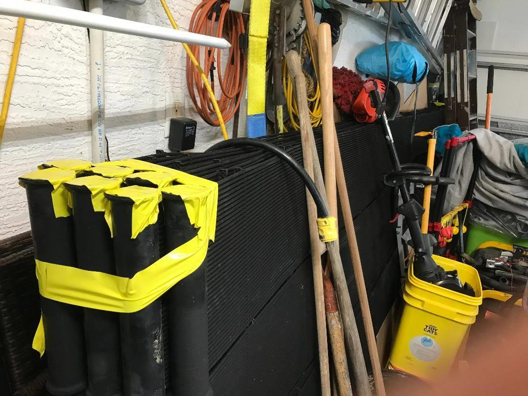 Bundle of seven plastic 12 ft x 4 ft panels, along with some assortment PVC pipe and fittings. Each panel weighs 22 lbs. Non-electric, flexible and stackable.