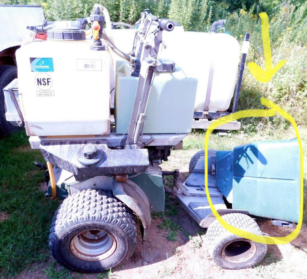 Green hard-plastic Fertilizer hopper is loose and not installed. Fertilizer hopper will also need to be collected with spreader/sprayer.