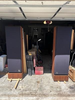 These are not ordinary speakers – they’re 1970s Infinity QLS-1 towers, fully restored by a specialist (crossovers rebuilt, drivers serviced, cabinets sealed, new grills, etc.). They are heavy, tall, and extremely fragile on the front baffle (line of tweeters and dome midranges).