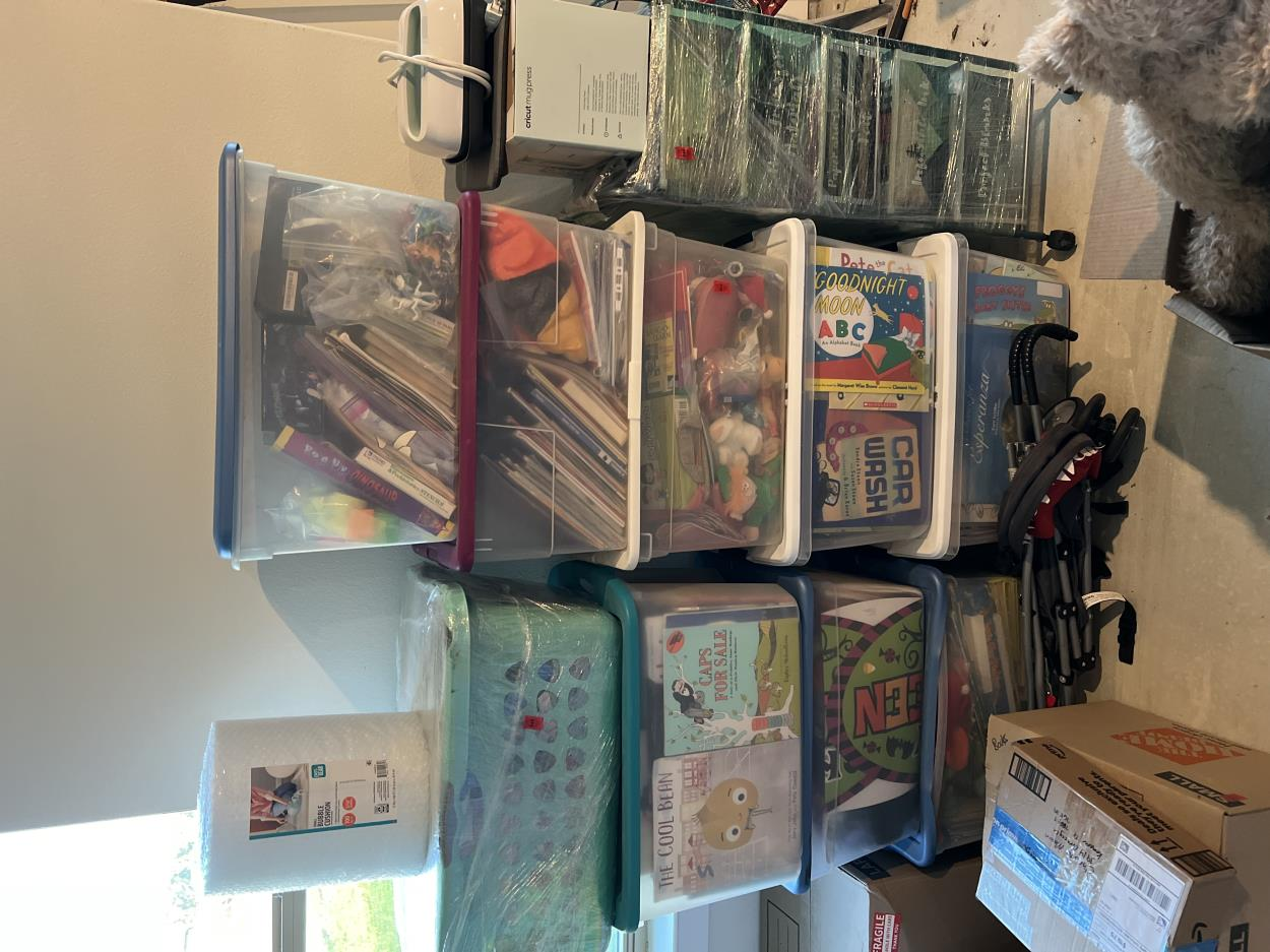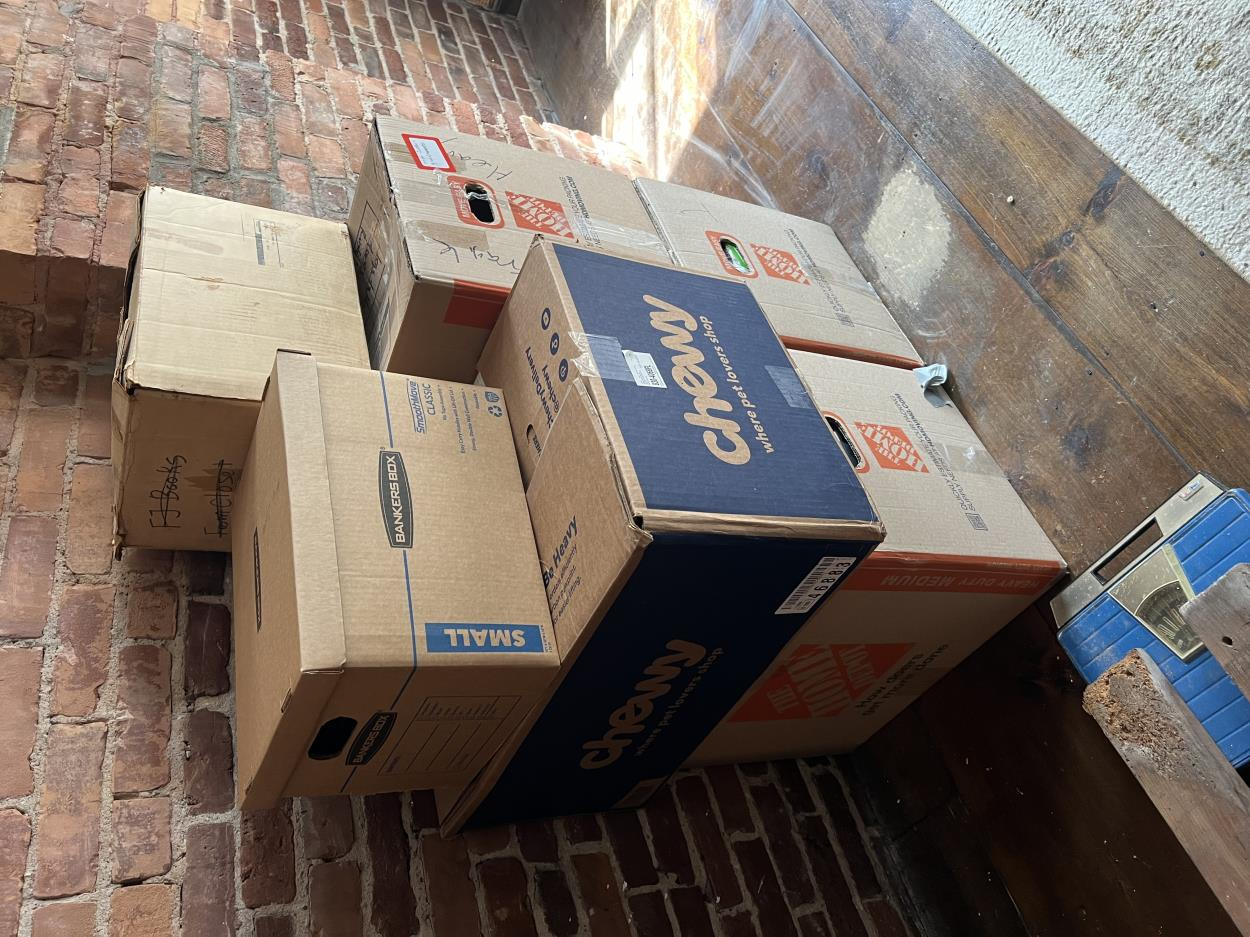There are 5 boxes, filled with books. They can be stacked and do not need special handling. There is one large painting that needs to be wrapped and cannot be stacked.