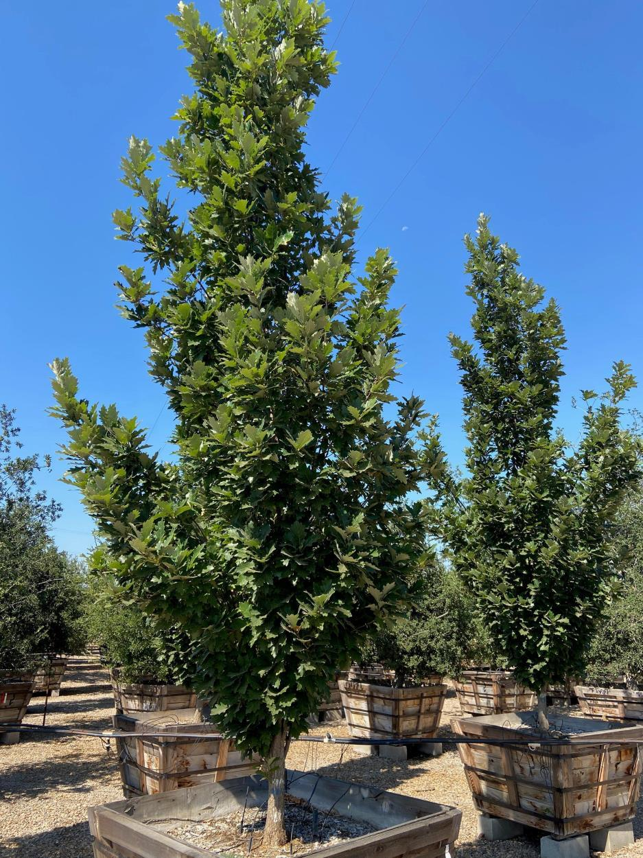 Two live columnar Oaks in 45-gallon containers, about 2.5-inch trunk caliper, approximately 10–12 feet tall each.