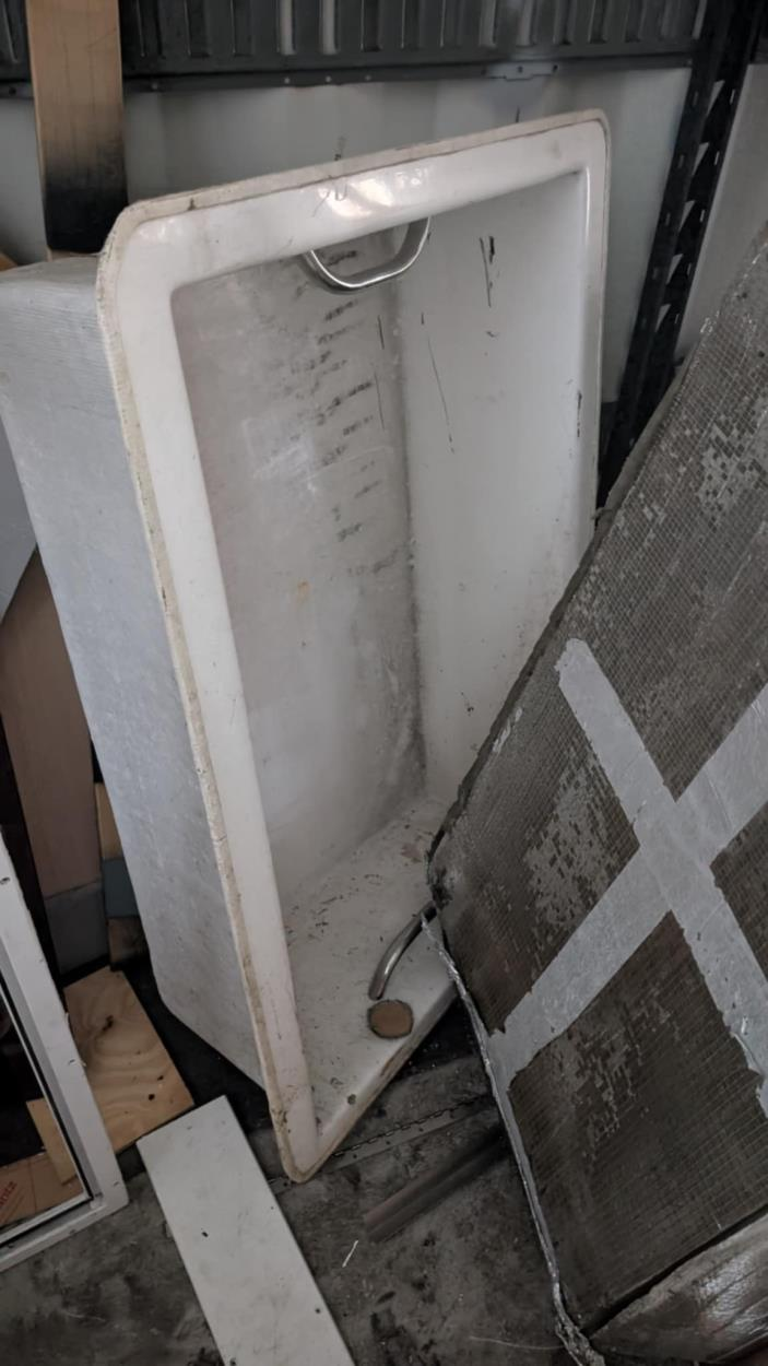 NO TOILET, IT IS THE TRAILER ONLY. NO WHEELS SO THEY CAN BE STACKED. WHEELS SHIP ON SIDE