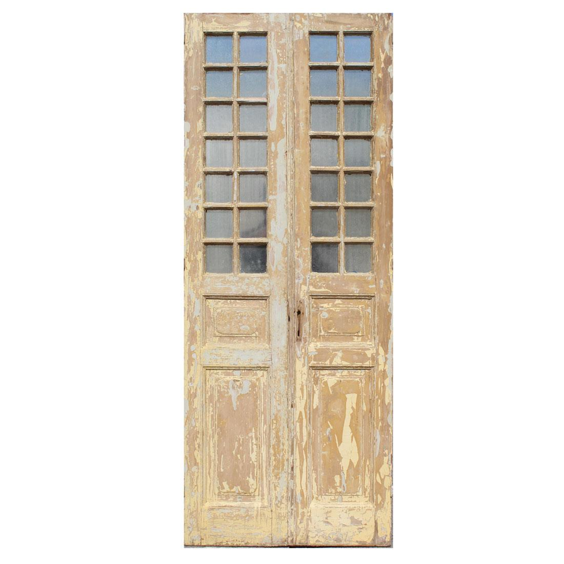 Wooden door pair with glass windows. Door pair does separate and each panel is stackable for easier transportation. Each panel measures approx. 19" wide and 93" tall.