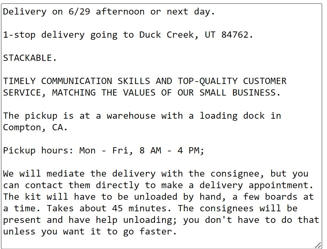 We will mediate the delivery with the consignee, but you can contact them directly to make a delivery appointment. The kit will have to be unloaded by hand, a few boards at a time. Takes about 45 minutes. The consignees will be present and have help unloading; you don't have to do that unless you want it to go faster.