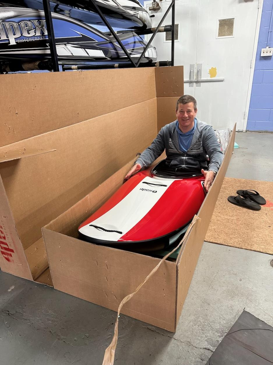 Obviously the dude doesn't get shipped and the box is closed. I wanted to show what is in the box. A carbon Fiber kayak, supported by blue foam bulkheads. You can pick up the box easily solo as it is very lightweight, but a bit bulky. Needs to be shipped in a dry area in the box. It can also be shipped taken out of the box, but kept in the included plastic bag, but can't get scuffed.