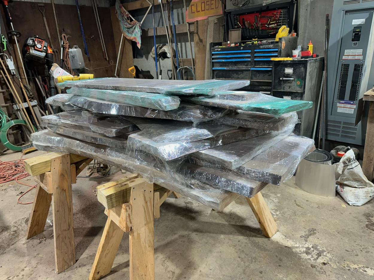 There are three 22 foot long wood slabs 24-36” wide by 2” thick, stacked. And there are a few other slabs stacked totaling 2’ h x 32”w x 8’L.