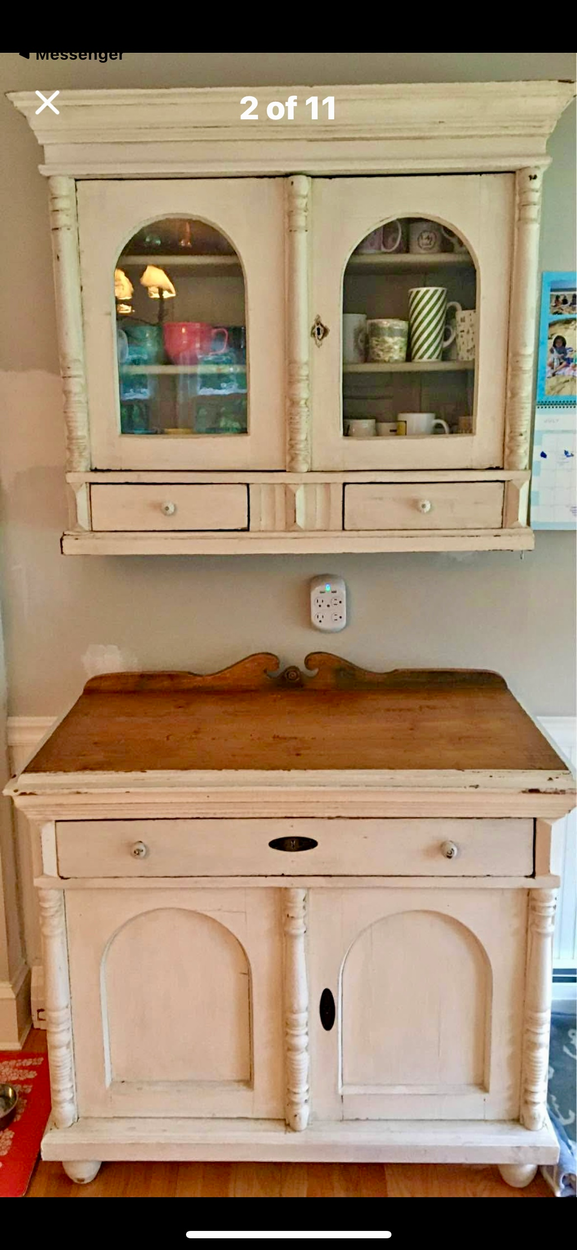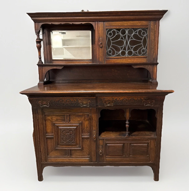 The item has one stained glass door and one mirror in the top half of the cabinet.