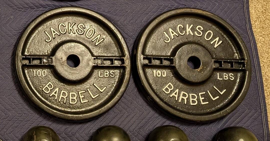 Total of 6, 100 pound metal weight plates. And small box of 3 1pounds weights. Total of about 603lb.