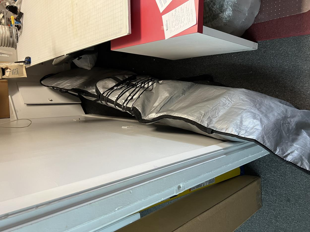 Fiberglass Surfboard in a bag and speargun in a bag. Will need to be secured to wall during shipping to avoid fins being broken.