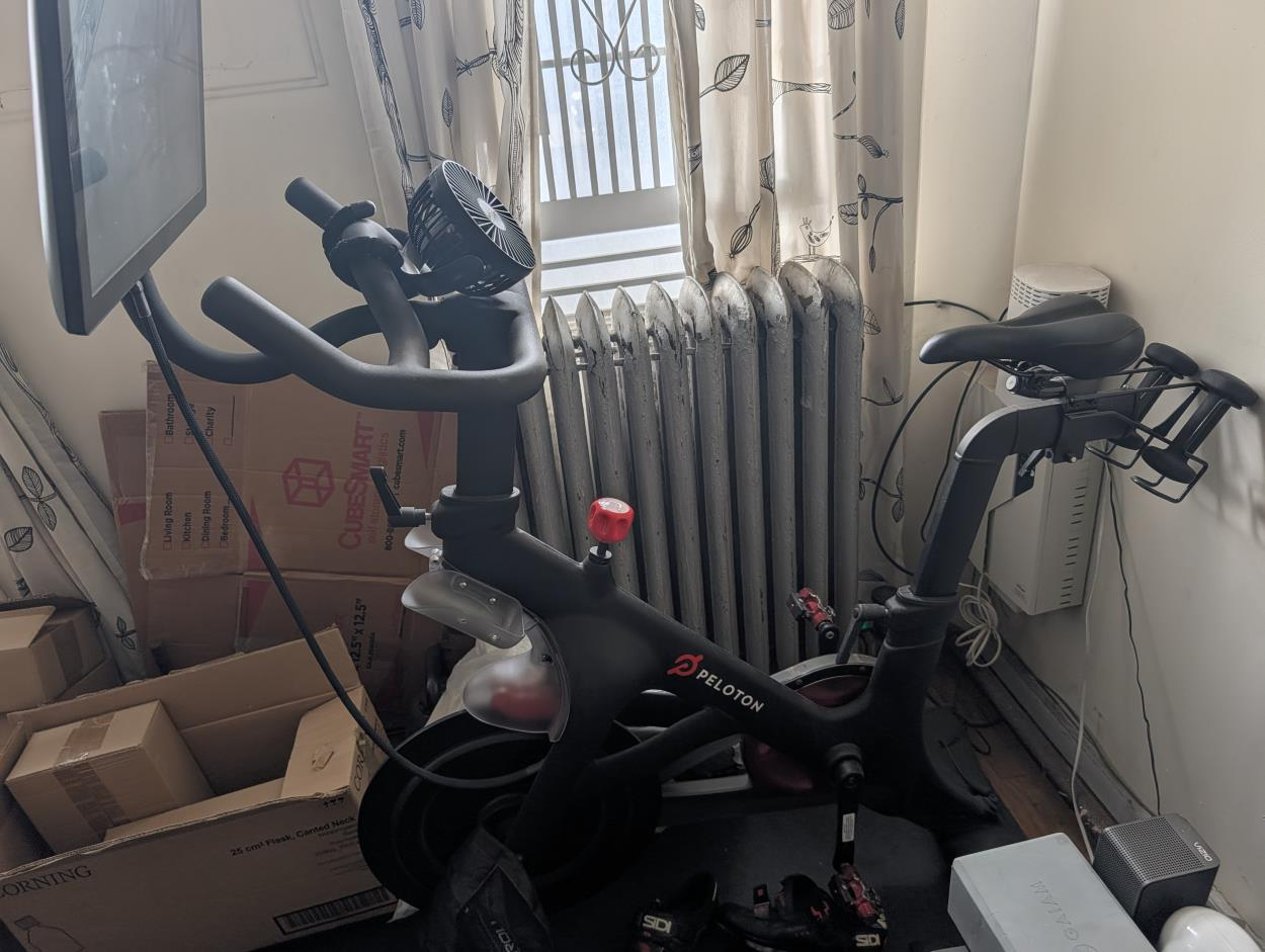 This exercise bike has two wheels on the back. You just have to pick it up by the front and can move it like a wheelbarrow.