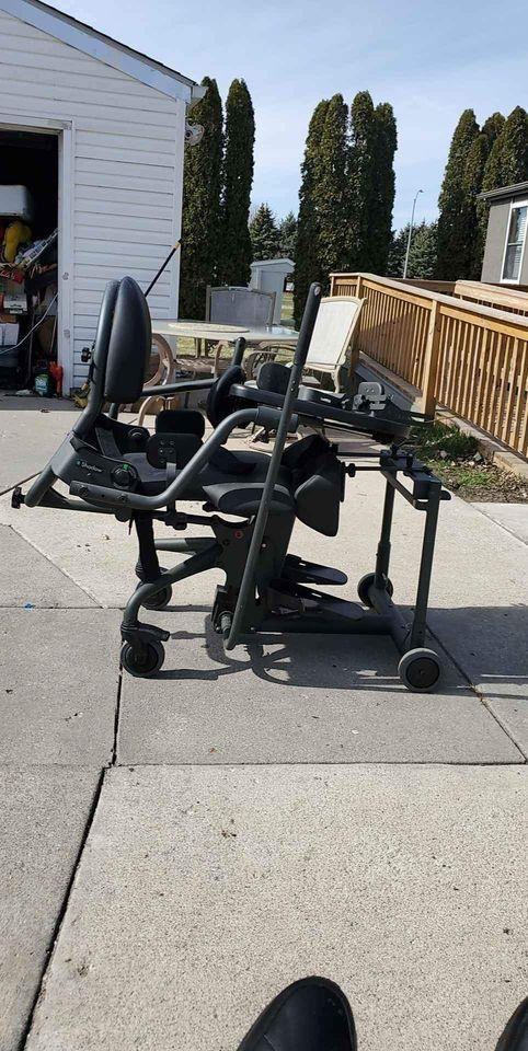 It is a standing frame chair for a disabled person. Very sturdy piece of equipment. Easy to move, as it is on wheels! Wheels lock. Can fit in a cargo van. Easy access to both residences.