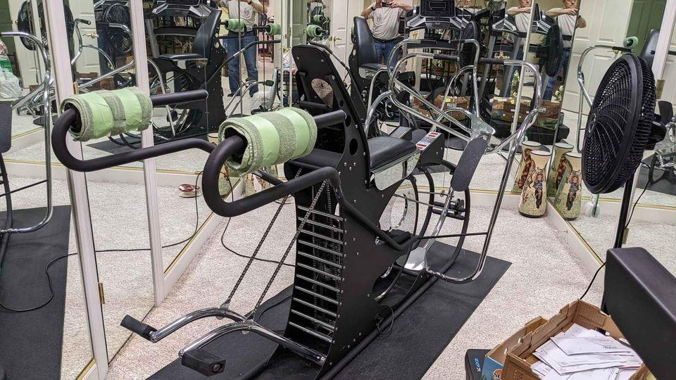 This machine has two small wheels on the back for easier loading unloadin. Needs to blanket wrapped and secured otherwise the arms bars will get all scratched up.