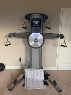 Weight is heavy, 200-350 lbs, must have 2 people to move it. 1 main machine (plus: tablet that looks like an iPad, stand for the tablet, poster, 6 handles - check that you have all these!). Please blanket wrap. Separate from the main machine, there is a small stand and a poster.