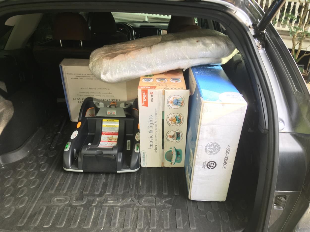 Two cardboard boxes with baby items will be shrink-wrapped together as one unit; this will be stackable. Another box (Item two) will be shrink-wrapped with a small car seat base and a soft mini-foam bath mattress.