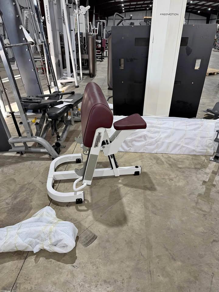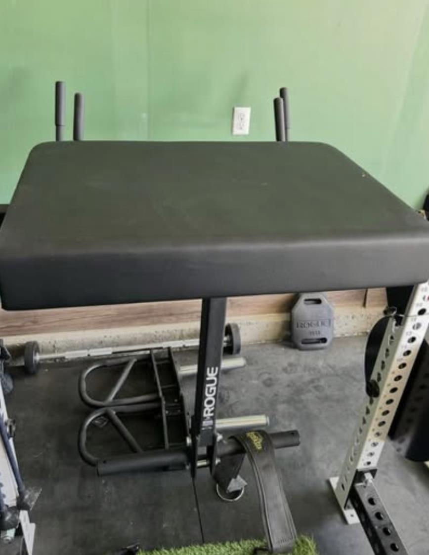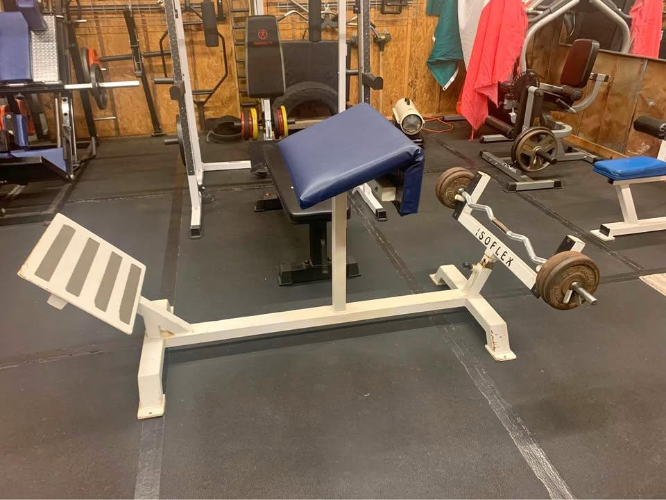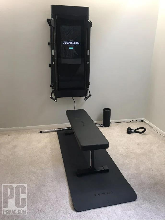 There is also accessories like a flat workout bench and gym handles that connect to the cables.