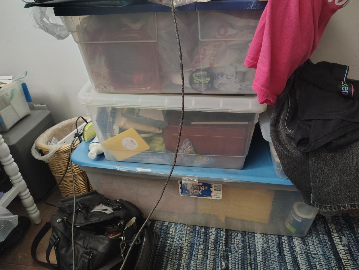 3 seater couch, side/night table, TV stand, coffee table, a few 27 gallon storage bins