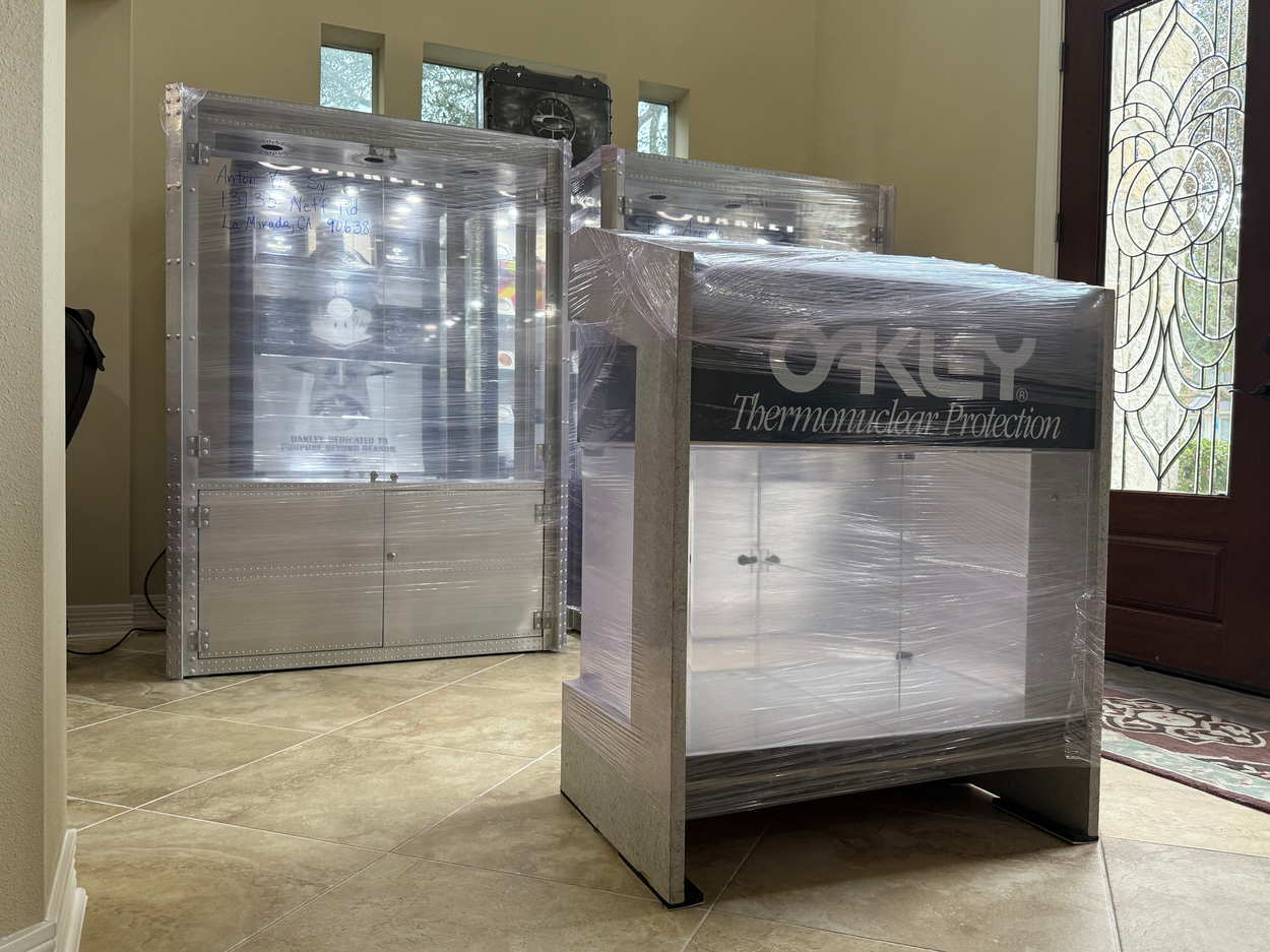 You will be transporting two aluminum Oakley Display Cabinets and another vintage Oakley display cabinet that is made out of MDF. All 3 have acrylic sides, but should be very easy to move with a furniture dolly. I will be available to help load them.