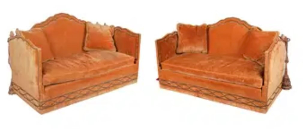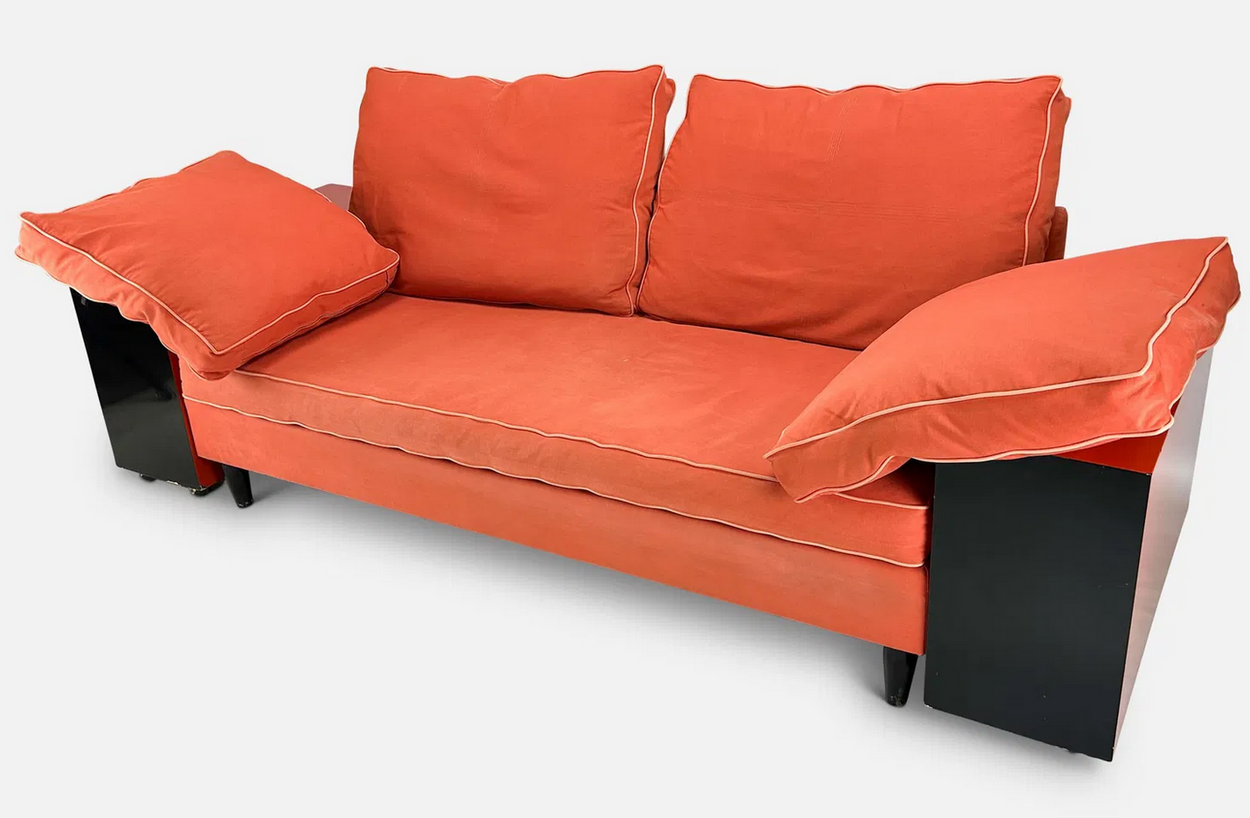 Sofa without rolling sides or cushions measures approx. 28" x 70 1/2" x 34". Each lacquer side measures approx. 23" x 12" x 35".