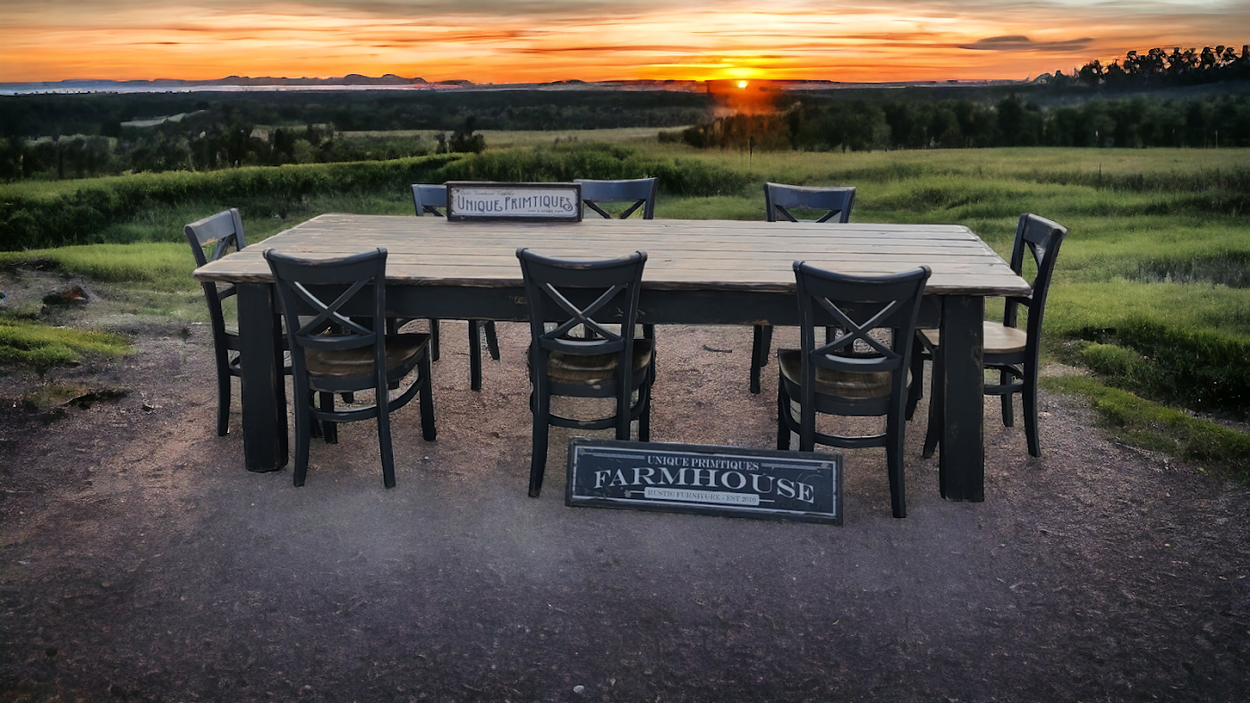 A 10-foot long (120") x 48" wide x 31"h rustic farmhouse table and 10-matching chairs