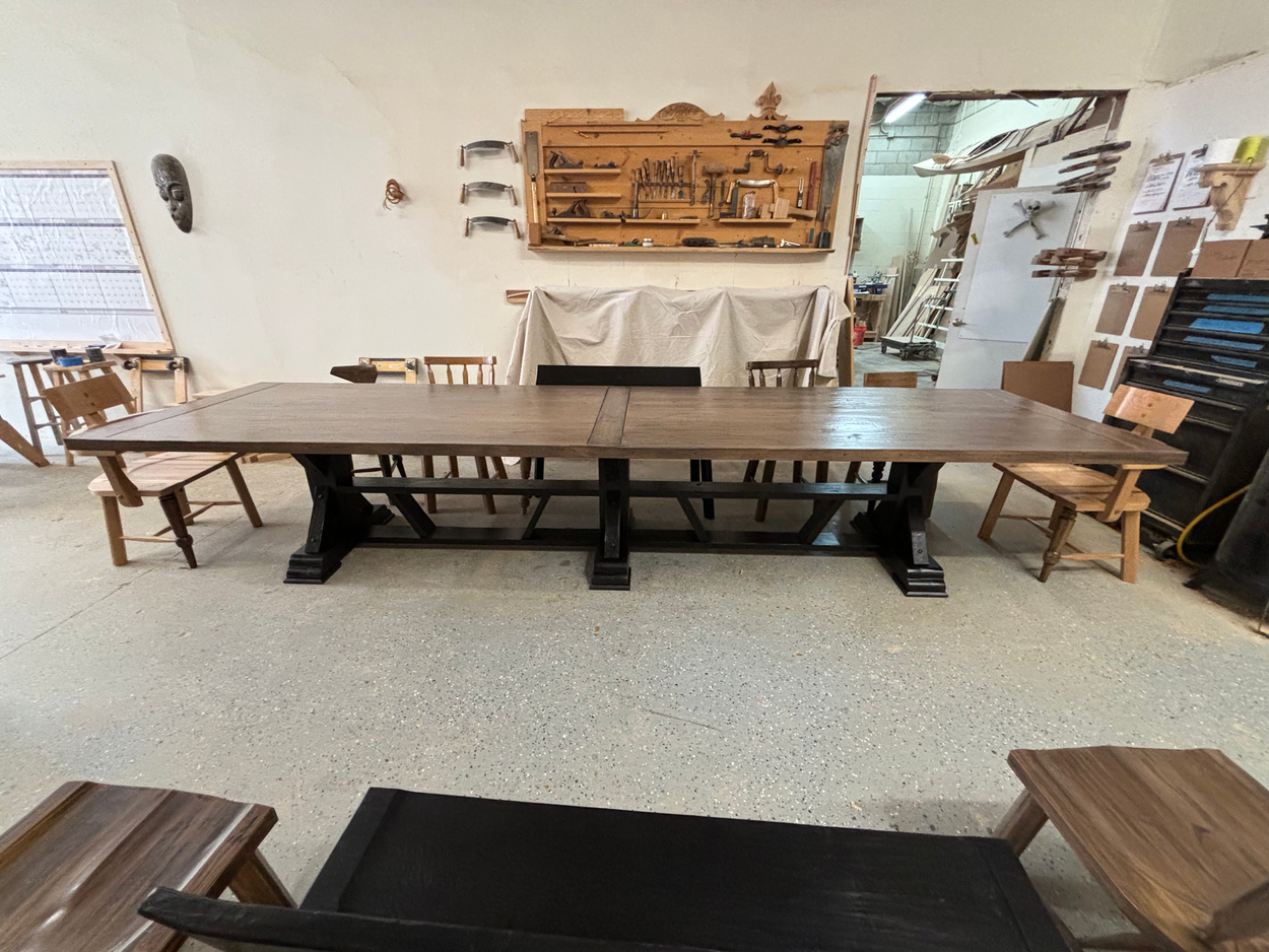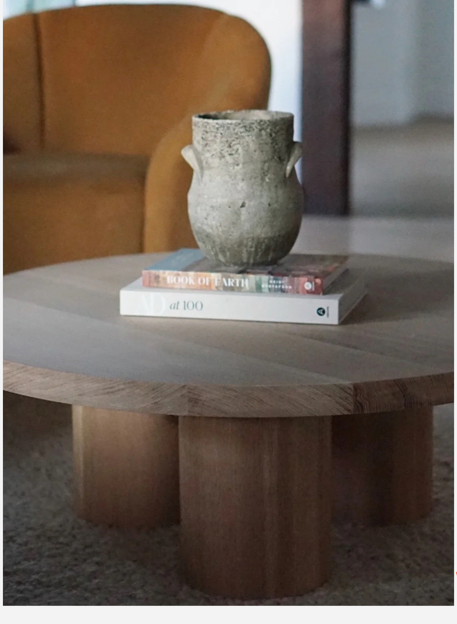 Legs and tabletop packaged separately. 41” diameter top. Legs are 8” diameter and 14” tall. No more than 50 pounds. Handmade. Please handle with care.