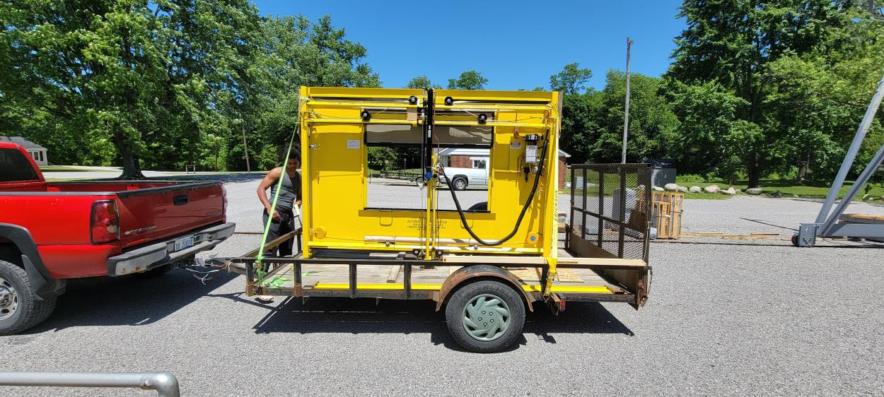 The yellow Automatic Sandblaster is what needs delivered. These are photos of previous machines that were delivered. The trailer is not included. It will need to go on your trailer. You will need to bring 4 ratchet straps to tie it down to your trailer. We will load it with our overhead crane. The customer receiving it will unload it with his forklift by using the lifting cable at the top center.