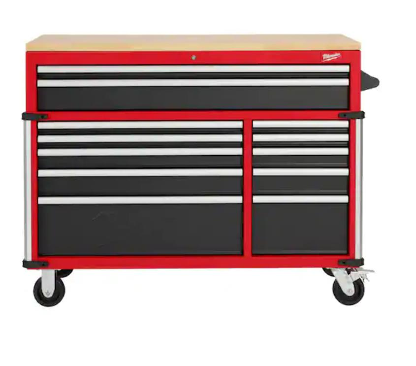 52" Milwaukee Tool Chest, full of tools with locked drawers so they will not open during transport. Has 4 heavy duty caster wheels to make the move easier.