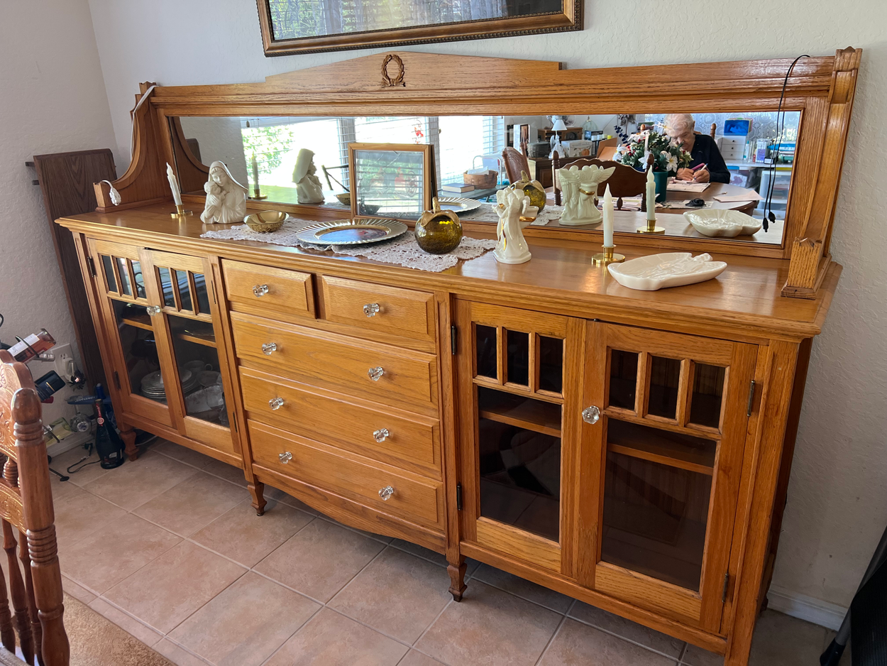 **TOP OF CABINET WILL BE REMOVED BEFORE MOVE *** - it will not have top wood or mirror piece and that part WILL NOT BE PART OF MOVE. Weights were all estimated. Do not have picture of table but it’s oak, round normal kitchen table- with six standard chairs.