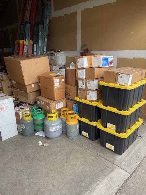 Various tools and parts, tallest extension ladder is 26 foot. Put smaller parts in storage containers. Total weight is probably closer to 2000-3000 lbs just with aprox 40-50 carrying total items
