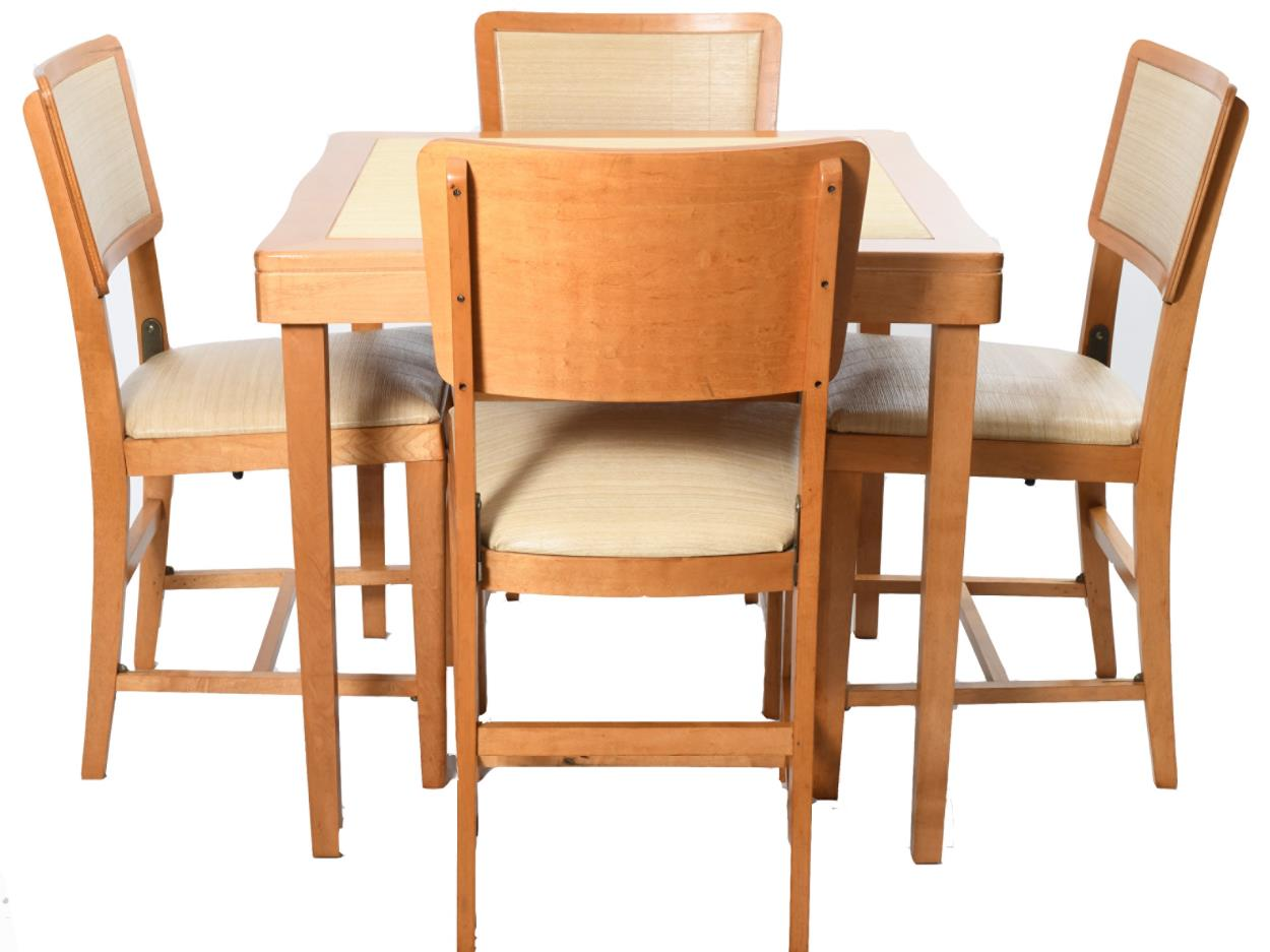 Chairs and table fold up as shown in image where they are leaning on wall.