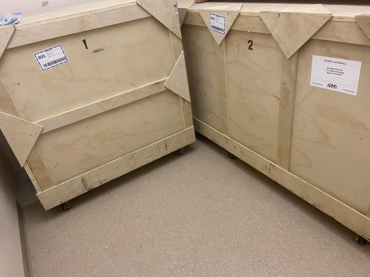 Both crates contain signs and educational panels.