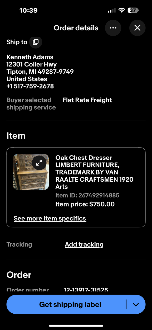 Order number Buyer Eberhardt/ Chairish 1302494 pair of palm trees