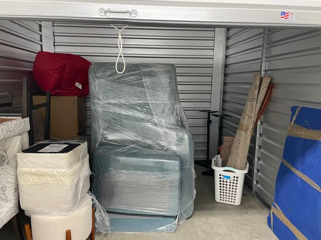 The 55" Samsung TV/Sectional Sofa/2 chairs/2 stools/ 3 suitcases with personal items/duffel bag with personal items/area rugs/stands/ Boxes seen in photo are all in a 10'x10' storage facility which as you can see does NOT fill the space. Would like a careful transporter to transport with securely and carefully and without damages.
