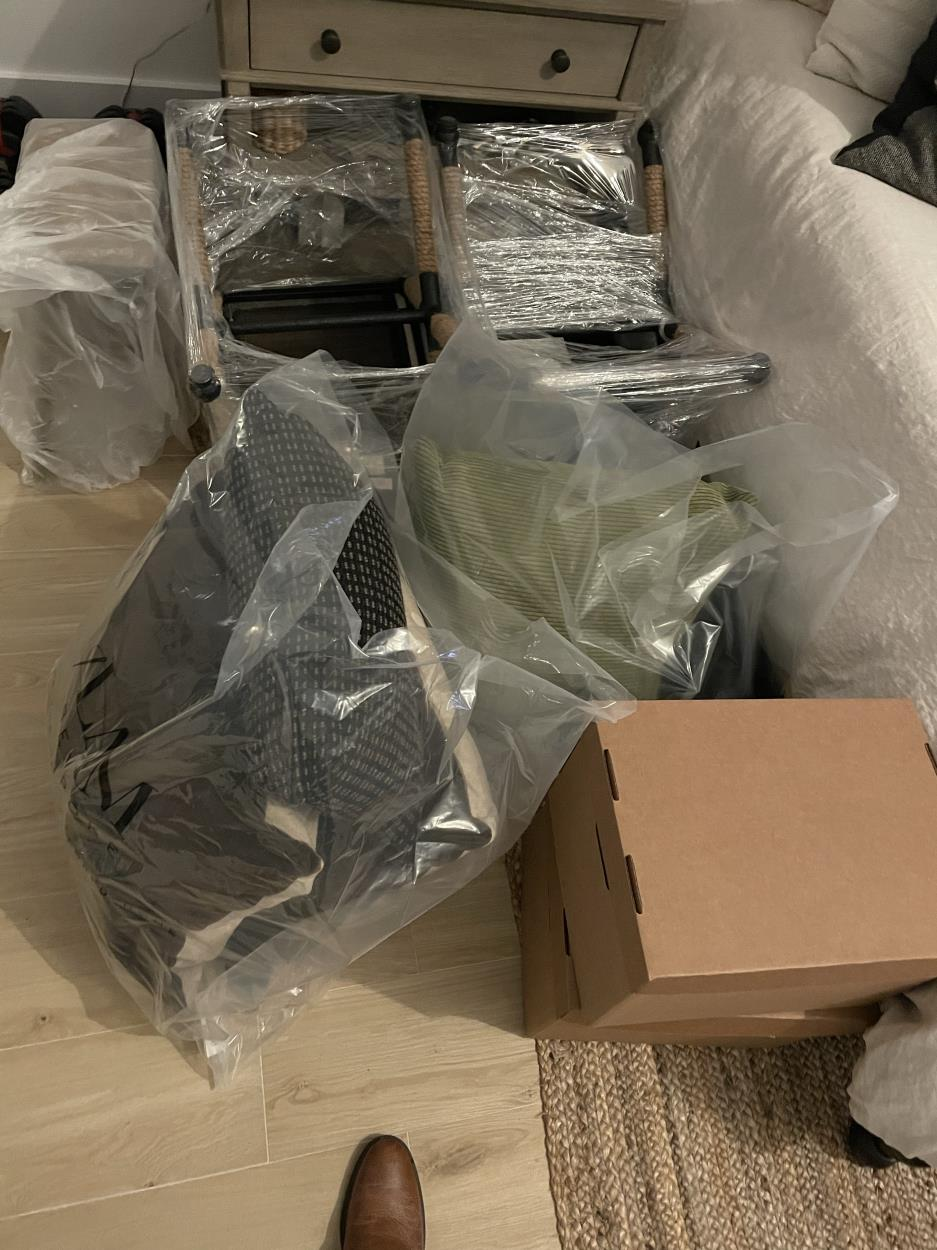 2 boxes (16x10x12), 1 stool (19x12x7), 2 small bedroom benches (23x19x16), 2 bags of pillows (23x23x12