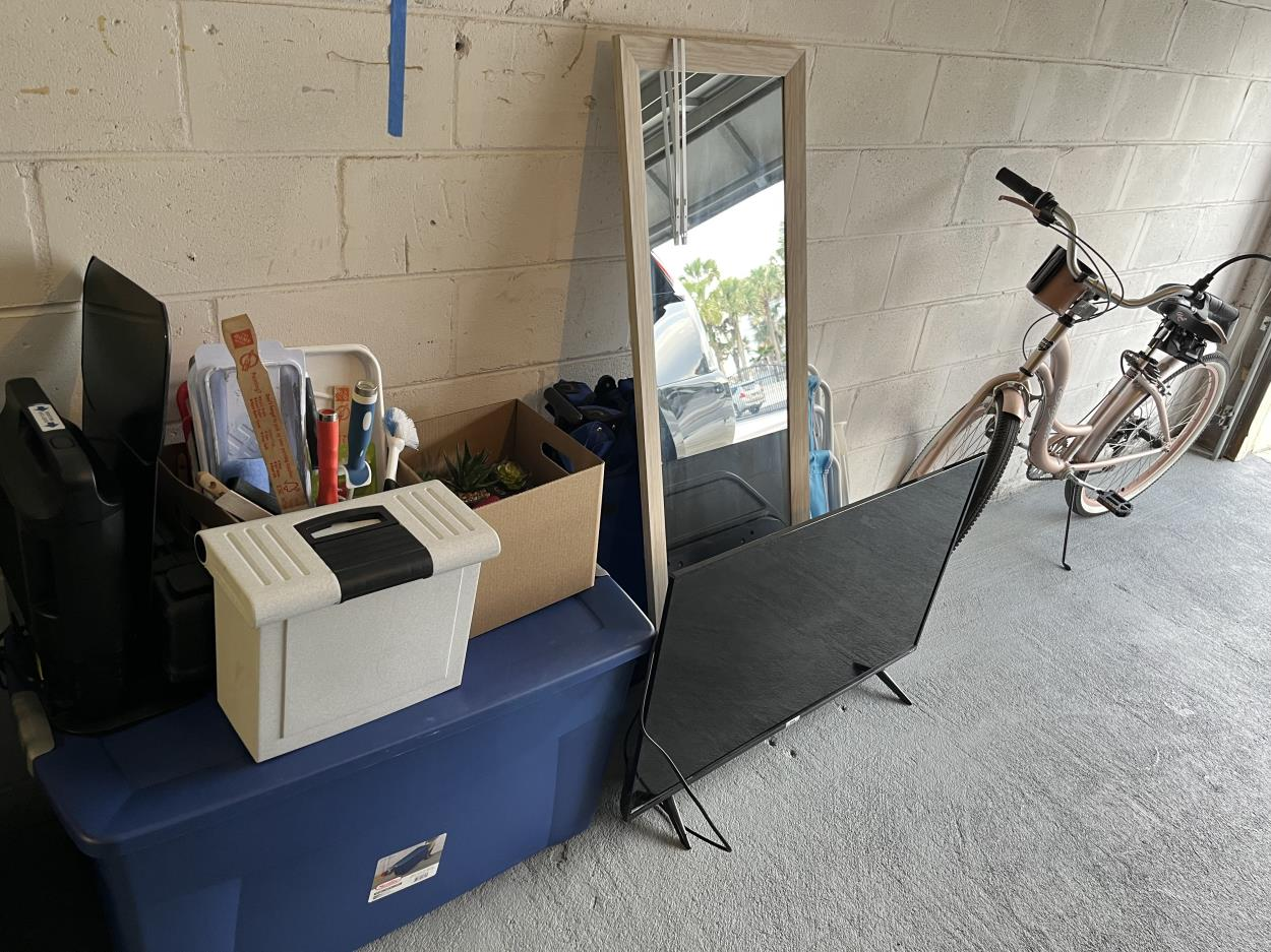 One bicycle, one TV, one standup mirror, two beach chairs, two plastic crates, one Roomba vacuum one box miscellaneous, one yeti cooler, one suitcase, one dehumidifier, one small table